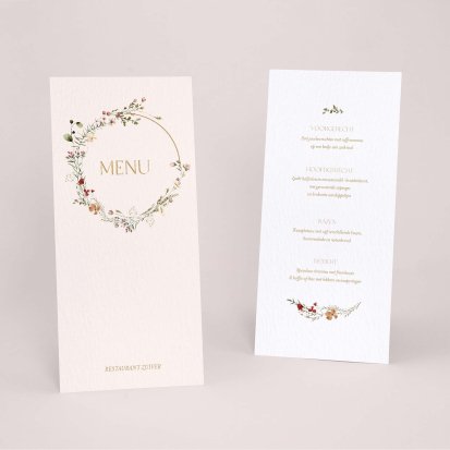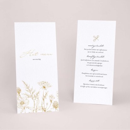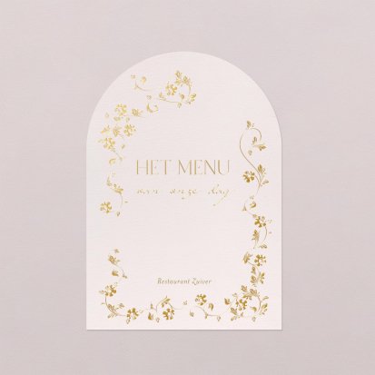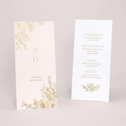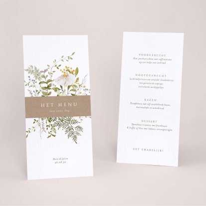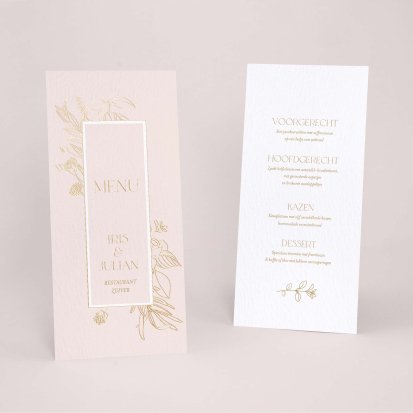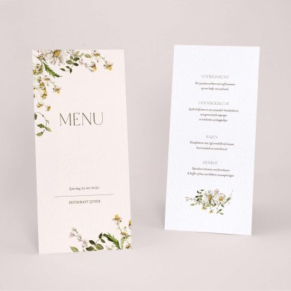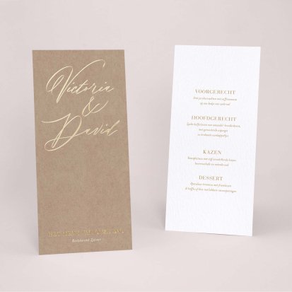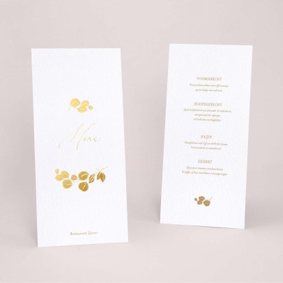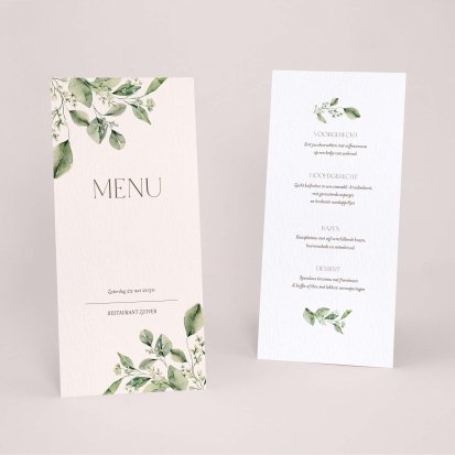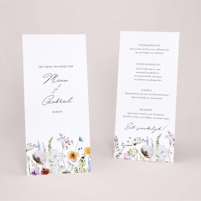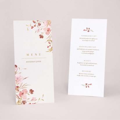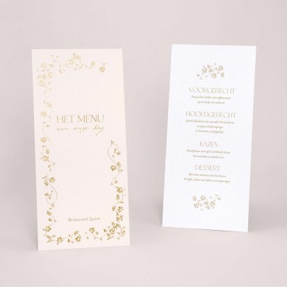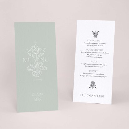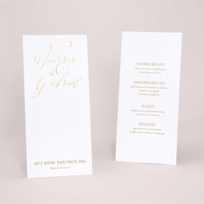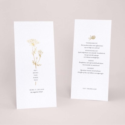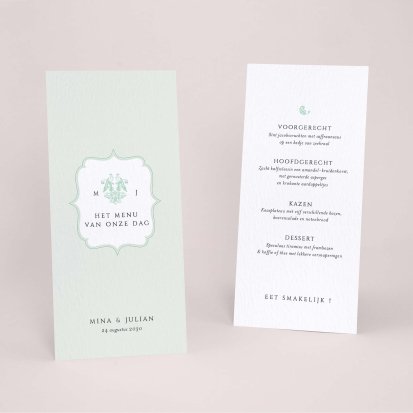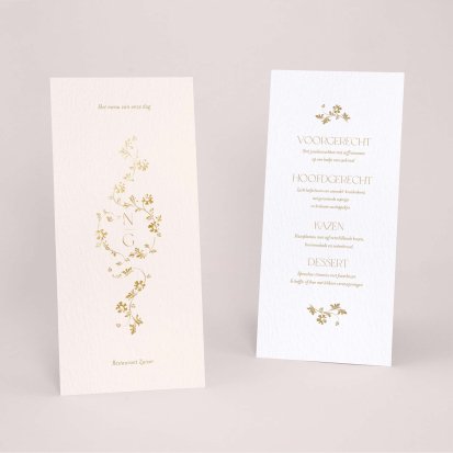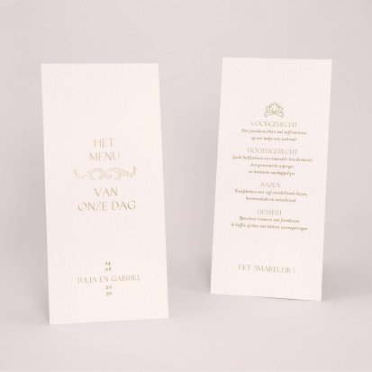 Laat je menu op onze menukaarten printen in de kleuren van jullie trouwkaart! Plaats de menukaarten op jullie tafels, zij maken de decoratie van jullie zaal af en jullie gasten vertrekken met een leuk souvenirtje aan deze prachtige avond. We raden aan om de menukaart in het midden van het bord samen met het tafelkaartje te plaatsen.