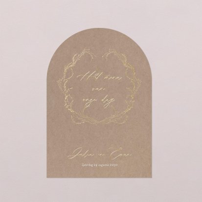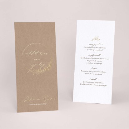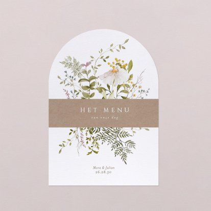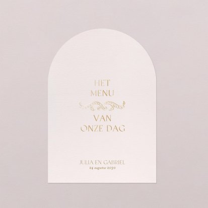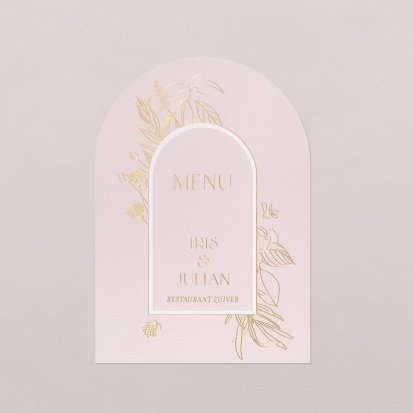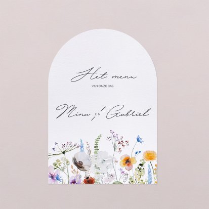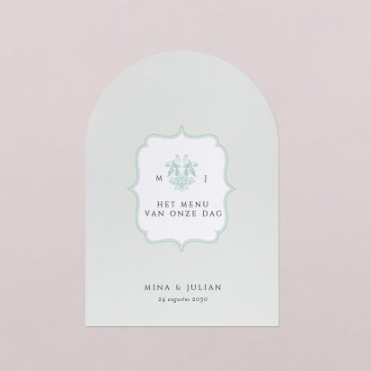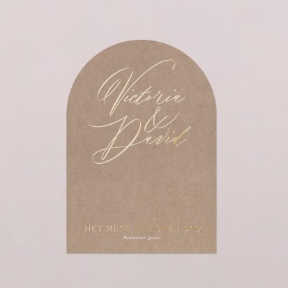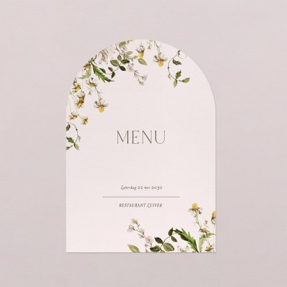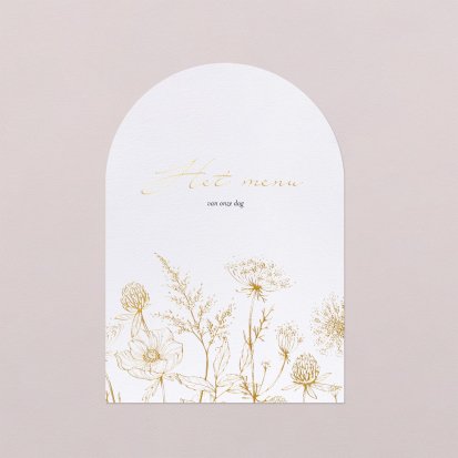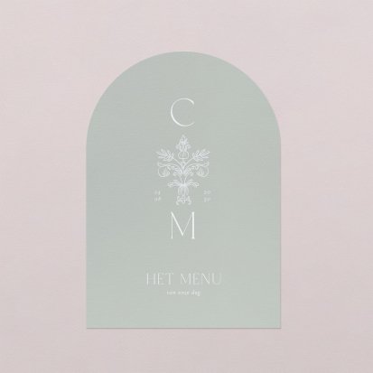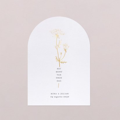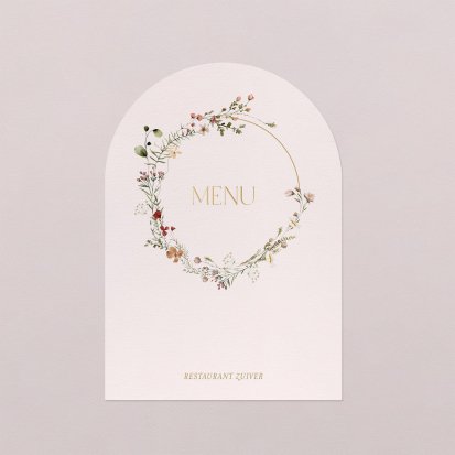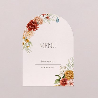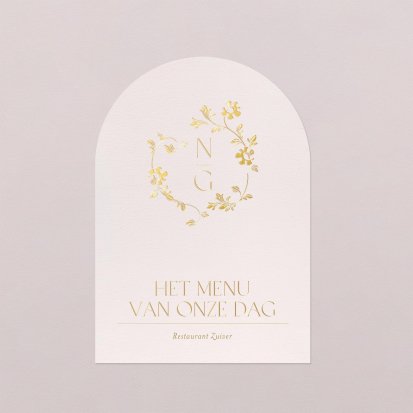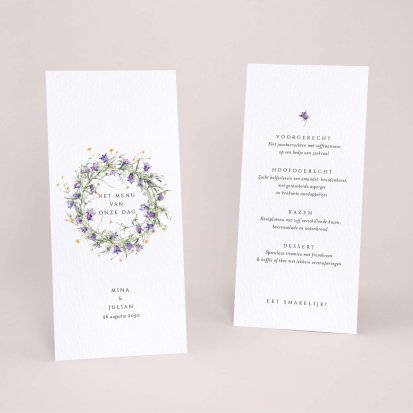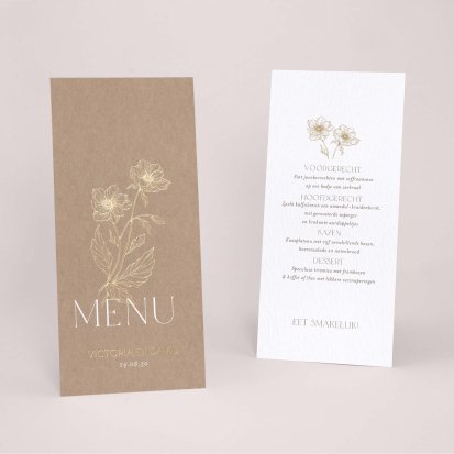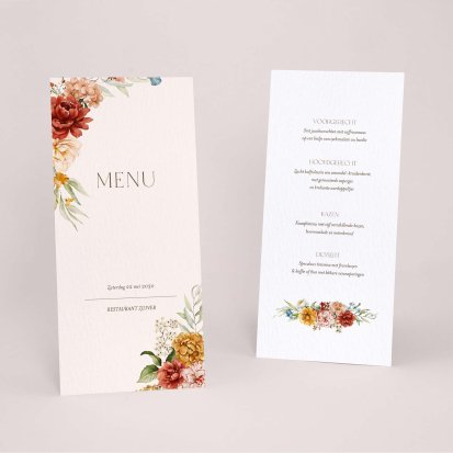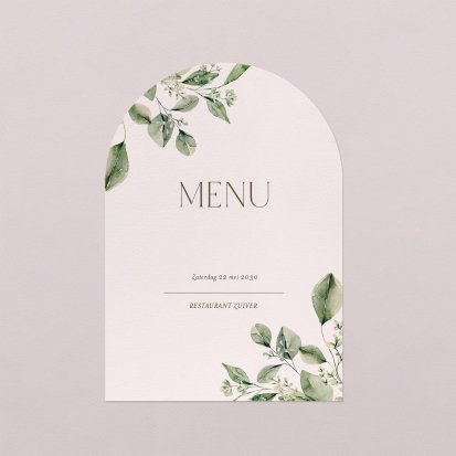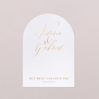 Laat je menu op onze menukaarten printen in de kleuren van jullie trouwkaart! Plaats de menukaarten op jullie tafels, zij maken de decoratie van jullie zaal af en jullie gasten vertrekken met een leuk souvenirtje aan deze prachtige avond. We raden aan om de menukaart in het midden van het bord samen met het tafelkaartje te plaatsen.