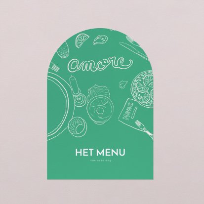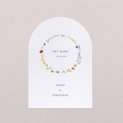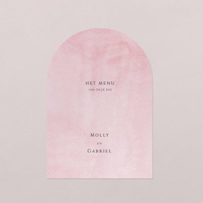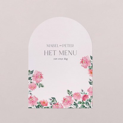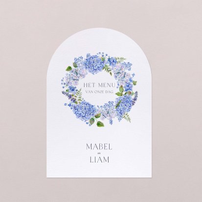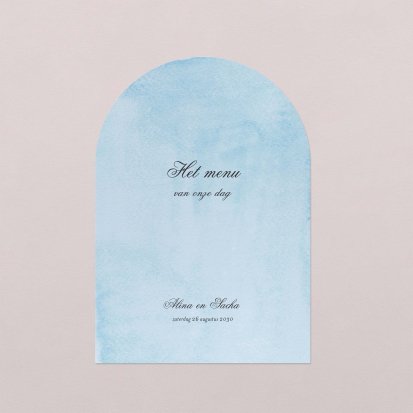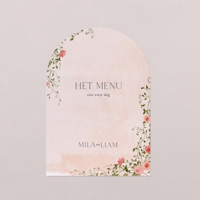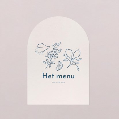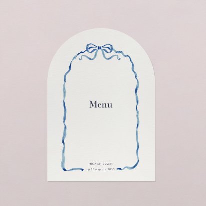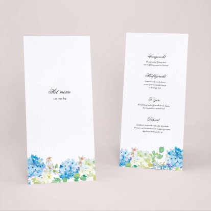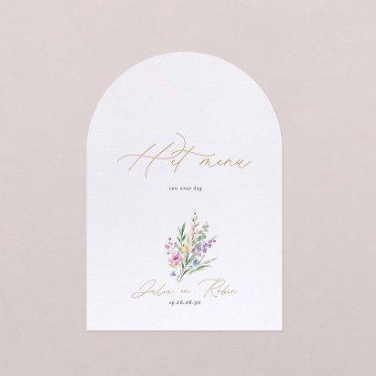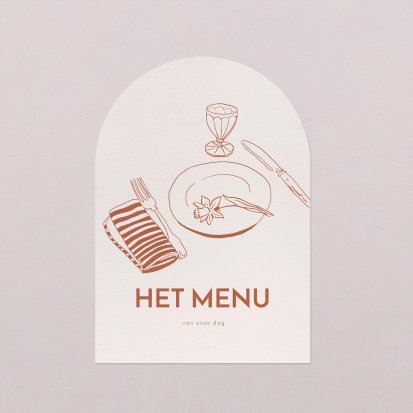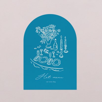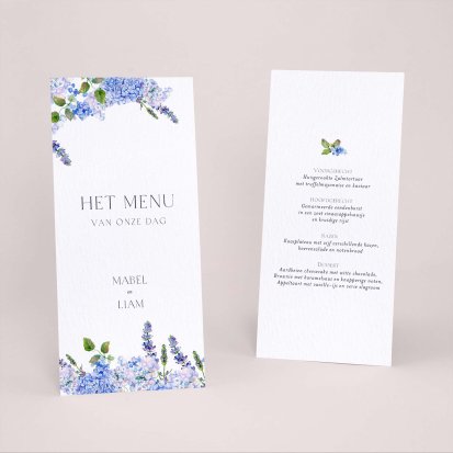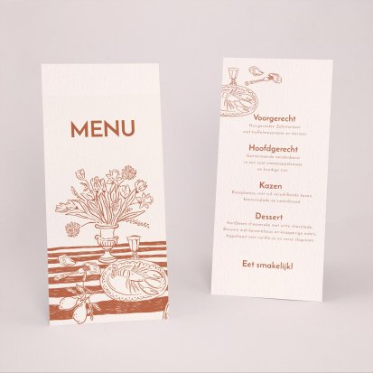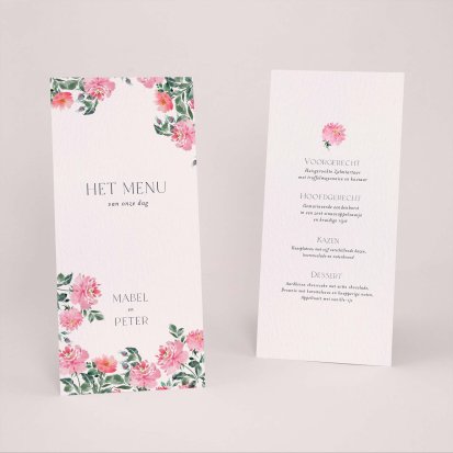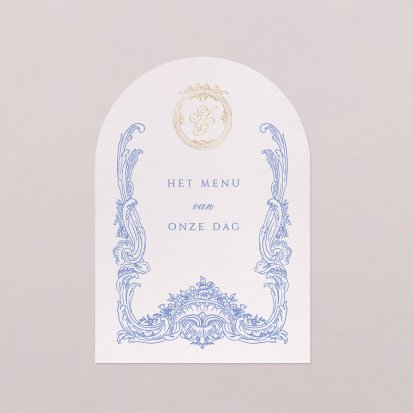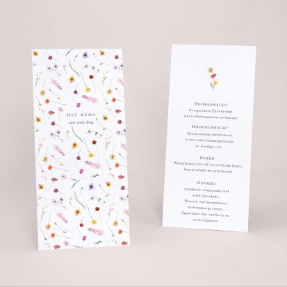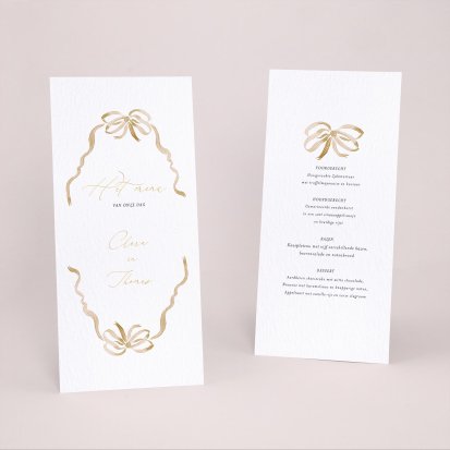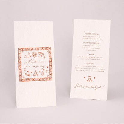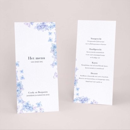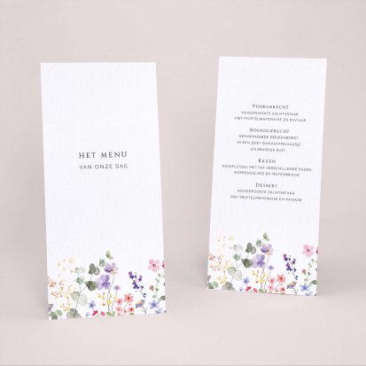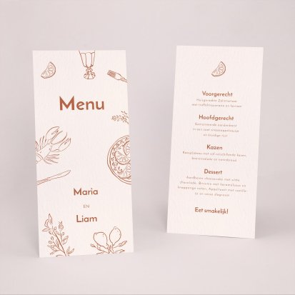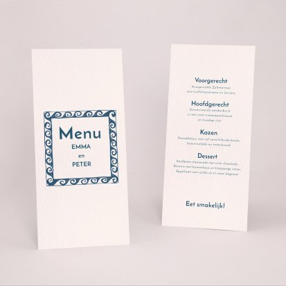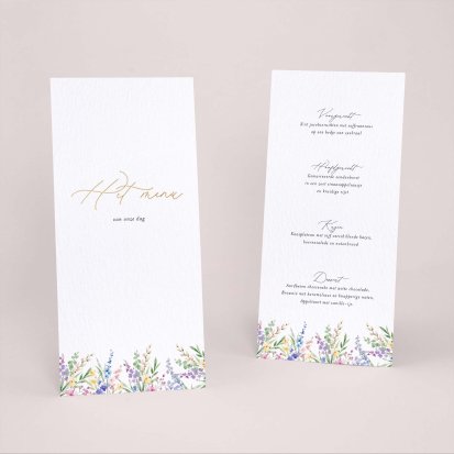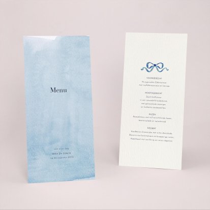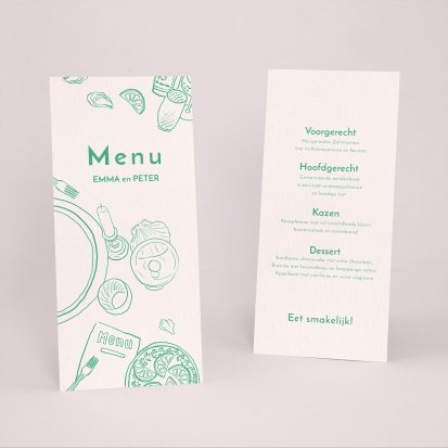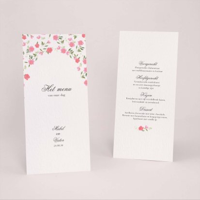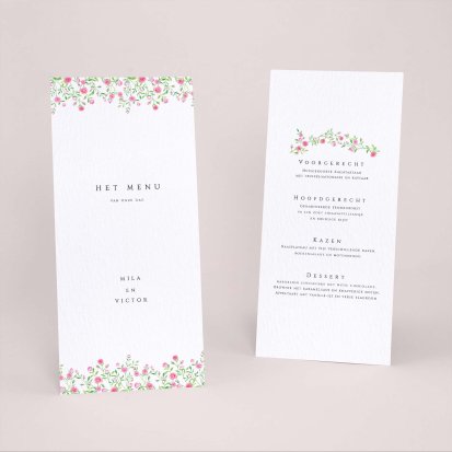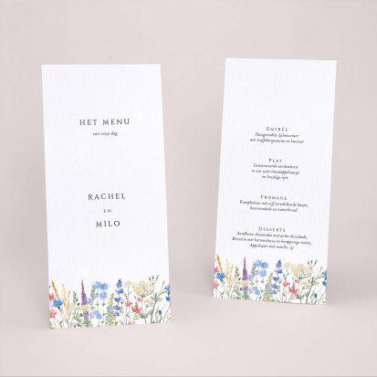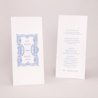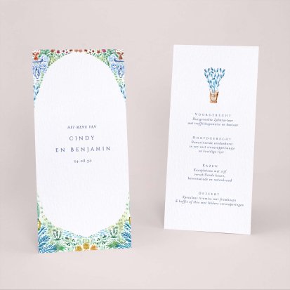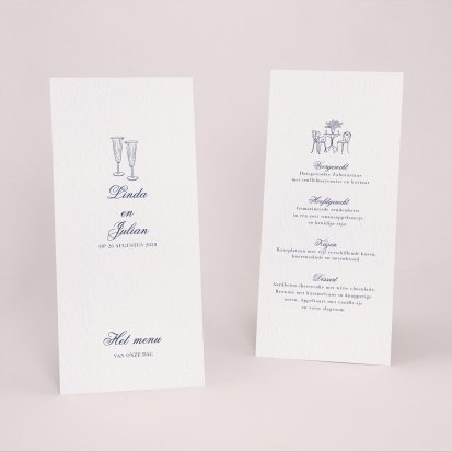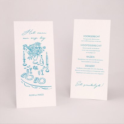 Laat je menu op onze menukaarten printen in de kleuren van jullie trouwkaart! Plaats de menukaarten op jullie tafels, zij maken de decoratie van jullie zaal af en jullie gasten vertrekken met een leuk souvenirtje aan deze prachtige avond. We raden aan om de menukaart in het midden van het bord samen met het tafelkaartje te plaatsen.