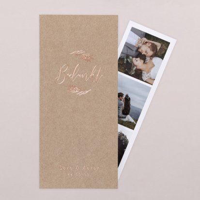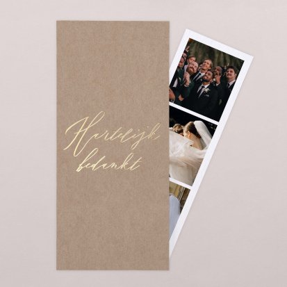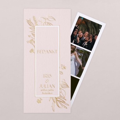 Met de schitterende bedankkaartjes van Cotton Bird verleng je de napret van jullie bruiloft. Neem een kijkje bij het uitgebreide assortiment om jullie perfecte bedankkaart te vinden en verstuur er een die helemaal past bij jullie stijl. Het hele jaar door worden de collecties door onze designers vernieuwd, zodat er iedere keer weer unieke bedankkaarten te vinden zijn. Ga bijvoorbeeld voor een bedankkaart met een grote foto van jou en je geliefde op de voorkant met romantisch afgeronde hoeken, of kies voor een bedankkaartje waar je een polaroid in kwijt kunt. Kies de mooiste foto van jullie samen uit en voeg een persoonlijke boodschap toe.