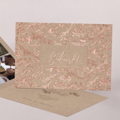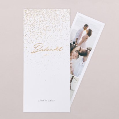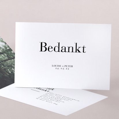 Twijfel je of je na de bruiloft al je gasten een bedankkaartje moet sturen? Niets moet, maar het gebaar wordt wel zeer op prijs gesteld door jouw lieve vrienden, familie en collega's die aanwezig waren op de bruiloft. Een paar weken na de bruiloft vinden jullie bruiloftsgasten een schitterende, chique envelop op de deurmat. Zodra ze deze openen zien ze jullie mooie foto's en lieve woorden en denken ze direct terug aan jullie grote dag. Bij Cotton Bird heb je de keuze uit de mooiste ontwerpen. Ga bijvoorbeeld voor een bedankkaart in dezelfde stijl als jullie save the date en trouwkaarten. Je kunt natuurlijk ook voor een heel ander ontwerp kiezen. Alle bedankkaartjes worden gedrukt op hoogwaardig papier en ontworpen met een oog voor detail.