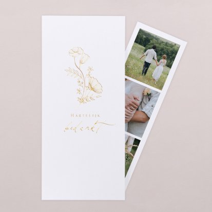 Jullie bruiloft was een dag om nooit te vergeten. Hebben jullie de grote dag gevierd met de beste vrienden en familie om jullie heen? Hebben jullie samen gelachen en genoten, zijn er nog grappige speeches gegeven en hebben jullie schitterende cadeaus in ontvangst genomen? Dan wil je jouw gasten natuurlijk graag bedanken voor hun aanwezigheid op jullie trouwen. Zonder de gasten was dit feest niet hetzelfde geweest. Daarbij hebben jullie prachtige foto’s van laten maken die je wilt delen. Er zijn genoeg redenen te bedenken om jouw gasten te verrassen met een mooie bedankkaart!