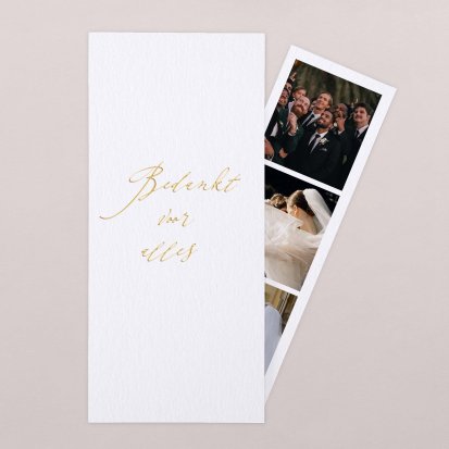 Hebben jullie iedereen al bedankt voor het komen op de bruiloft zelf? Dan wil je misschien niet iedereen nog eens een bedankkaart sturen. Dit kan natuurlijk wel! Zeker bij een klein feest valt het aan te raden om iedereen nog eens een prachtig kaartje te sturen om ze te bedanken voor hun komst en de gezelligheid. Bij een groots feest, kunnen de kosten vanwege bijvoorbeeld de postzegels snel oplopen. Laat dit je niet weerhouden van het versturen van een bedankkaart. Je kunt bijvoorbeeld ook alleen jullie beste vrienden of de familie waarmee je het meest close bent nog een extra kaartje sturen.