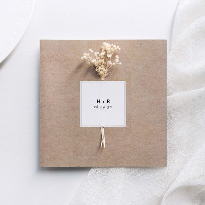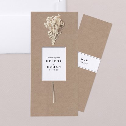 Kraftpapier is een biologisch afbreekbare en recyclebare papiersoort. Kies jij voor trouwkaarten met bloemen vanwege de ecologische uitstraling? Dan is het erg leuk om een trouwkaartje van kraftpapier te combineren met een droogbloemetje. Deze stevige papiersoort ziet er authentiek uit en is erg duurzaam. Doordat het veel sterker is dan gewoon papier, krijgt de uitnodiging ook een robuuste look. Kies voor een witte opdruk op de trouwkaart van kraftpapier voor een prachtig contrast.