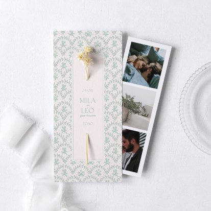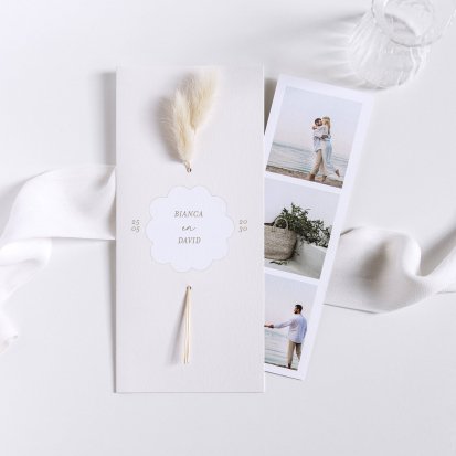 Vind je het leuk om je trouwkaarten een extra persoonlijke touch te geven? Kies dan voor een van de trouwkaarten die je kunt personaliseren met je eigen foto. Laat de favoriete foto van jou en je geliefde op de voorkant drukken, of kies voor een exemplaar waar je een fotostrip in kwijt kunt. Op de fotostrip is ruimte voor 3 foto's en de losse strip kan gemakkelijk worden opgehangen of neergezet. Voeg de foto's toe in de online editor om zo je kaartje naar wens aan te passen.