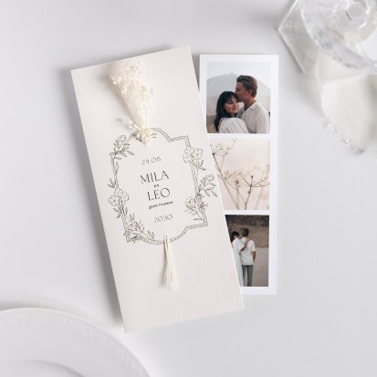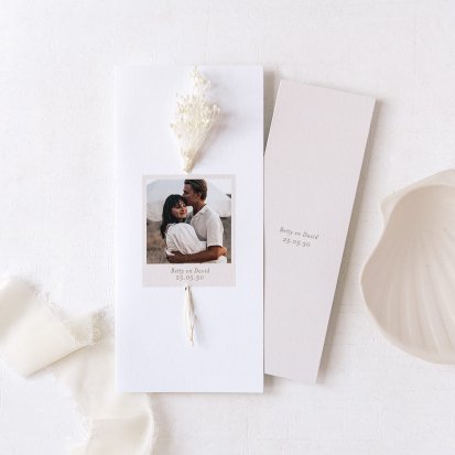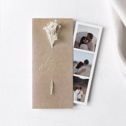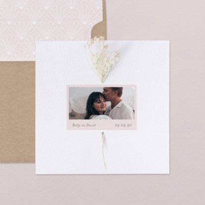 Wanneer je kiest voor trouwkaarten met droogbloemen, heb je de keuze uit een groot aantal mooie ontwerpen. Zo zijn er onder meer trouwkaarten gedrukt op premium gestructureerd papier en trouwkaarten gedrukt op kraftpapier. We hebben enkele trouwkaarten en dubbele trouwkaarten, vierkante trouwkaarten en rechthoekige trouwkaarten. Sommige trouwkaarten zijn te personaliseren met je eigen foto. De droogbloemen zijn gemakkelijk door de trouwkaart te steken of ze gaan onder een kalklaag hoesje dat je om de trouwkaarten heen schuift.