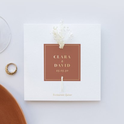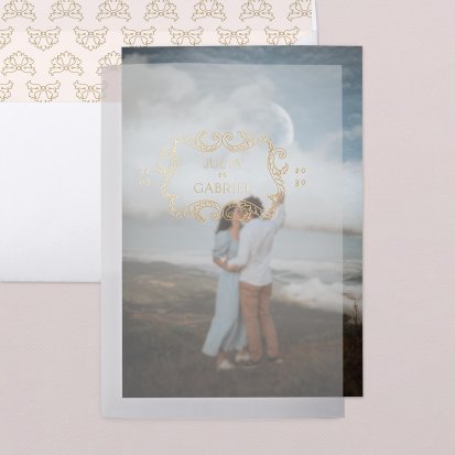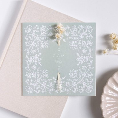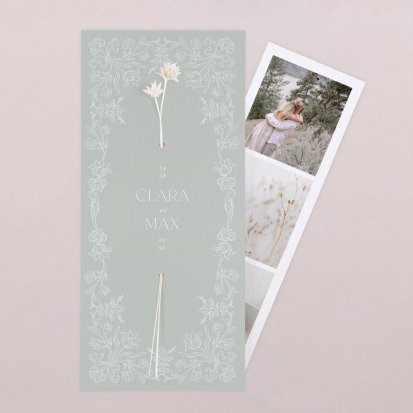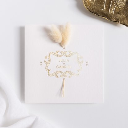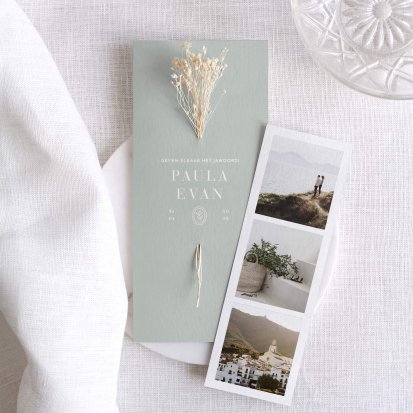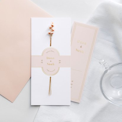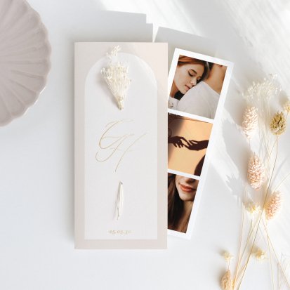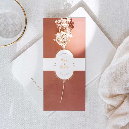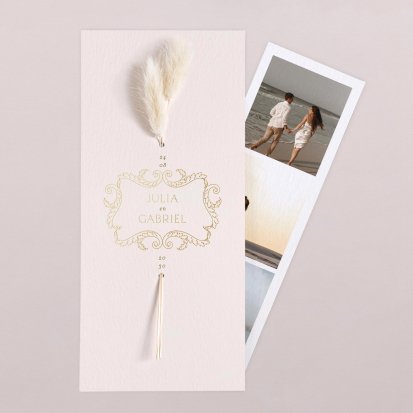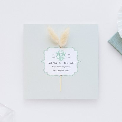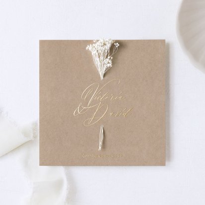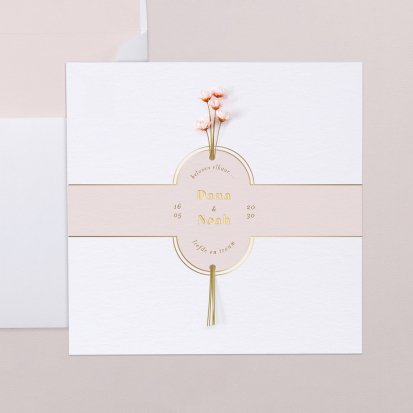 Veel van de schitterende trouwkaarten met droogbloemen zijn te voorzien van foliedruk. Laat jullie namen en de datum van de trouwdag in goud- of koperfolie op de voorkant van de uitnodiging drukken. Het folie komt op het papier te liggen, wat een diepte-effect geeft. Daarnaast is goudfolie erg populair omdat het er luxe uitziet en een romantisch gevoel toevoegt aan de trouwkaarten. Zeker in combinatie met een kalklaag krijgt je uitnodiging een exclusieve uitstraling.