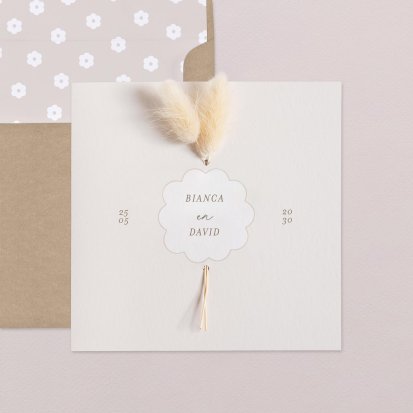 Je kiest zelf voor de gewenste bloemen in je trouwkaart. Cotton Bird heeft diverse soorten gedroogde bloemen die je mee kunt bestellen. Ga bijvoorbeeld voor de tijdloze Amarelino voor een moderne, chique look. De Spigadoro heeft een natuurlijke tint en is daardoor ideaal voor een rustiek chic trouwthema. Het toevoegen van Gipskruid geeft jullie uitnodiging net wat extra's. Tijdens het bestelproces geef je aan welke droogbloemen je wilt bestellen. Afhankelijk van de kaart en het type bloem, wordt een bepaald aantal bloemetjes aangeraden. Omdat de droogbloemen breekbaar zijn, raden we aan om er voorzichtig mee om te gaan. Vaak is het verstandig om de uitnodigingen direct aan jullie gasten mee te geven in plaats van deze op de post te doen.