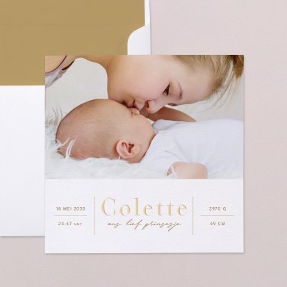 Geboortekaartjes met foliedruk maken jouw kaartje net wat opvallender en specialer. De foliedruk wordt bovenop de kaart gedrukt, waardoor het geboortekaartje een tof 3D effect krijgt. In onze ontwerpen vind je onder andere geboortekaartjes met een gouden foliedruk en geboortekaartjes met een koperen foliedruk. De kaartjes personaliseer je verder met een eigen foto, een gedichtje of bijzondere tekst en natuurlijk de naam en geboortespecificaties van jouw kindje, zoals de lengte, het gewicht, de datum en tijd van de geboorte. Heb jij een kaartje op het oog? Zodra je weet wat het formaat van het geboortekaartje wordt, kan je alvast enveloppen bestellen en deze van postzegels en adressen voorzien. In je kraamweek heb jij dan alle tijd voor jezelf en je kleintje. Heb jij geen zin om alle adressen met de hand te schrijven? Neem dan eens een kijkje bij de adresstickers. Deze stickers zijn verkrijgbaar in ontwerpen in dezelfde stijl als het geboortekaartje en staan erg leuk op de enveloppen.