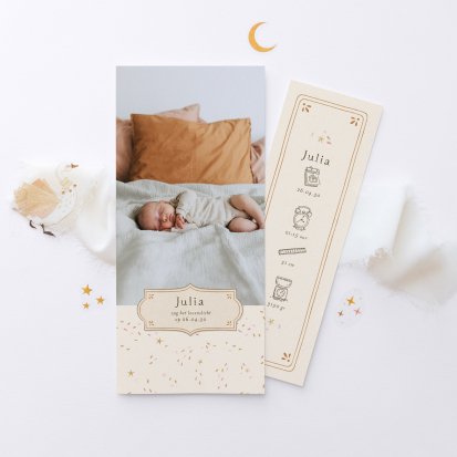De naam van je kleintje en overige geboortedetails, zoals de geboortedatum en eventueel lengte en gewicht, komen vaak op de voorkant van het kaartje te staan. Vergeet ook niet om je contactgegevens aan het geboortekaartje toe te voegen en eventuele informatie over kraamvisite of een kraamfeest te vermelden. Vraag de ontvangers bijvoorbeeld om vooraf even contact op te nemen met je partner om een datum of tijd af te spreken die jou schikt. Misschien lijkt het je erg leuk om veel kraamvisite te ontvangen en maakt het niet uit wanneer ze op de stoep staan, maar vaak is het wel prettig om te weten wanneer je wie kunt verwachten. Plan ook niet iedere dag een bezoekje in, maar hou ook wat dagen vrij om samen te genieten van je nieuwe gezinssituatie. Aan de binnenkant, of op de achterkant van de meeste kaartjes is ook ruimte voor een schattige geboortetekst of een gedichtje. Hiermee laat je jouw kindje weten hoe gewenst hij of zij is en hoe blij je bent met de komst van je jongste telg.