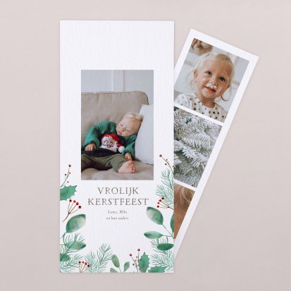 De kerstkaarten met fotostrip zijn net een beetje anders dan de traditionele kerstkaart. Deze hippe kerstkaarten zijn voorzien van een fotostrip binnenin de dubbelgevouwen kaart. De fotostrip bevat meerdere foto's, waardoor je de meest bijzondere momenten van afgelopen jaar kunt delen met jouw dierbaren. Ook kan het worden opgehangen als decoratie of als boekenlegger worden gebruikt. Je hebt de keuze uit een groot aantal verschillende ontwerpen, waardoor je een kerstkaart maakt die helemaal aansluit bij jouw wensen. Ontvang jij zelf ook veel kerstkaarten? Soms heb je niet genoeg plek op de vensterbank of open haard om alle wenskaarten neer te zetten. Je maakt het extra gezellig in huis door de kerstkaarten op te hangen aan een slinger kerstlampjes!