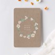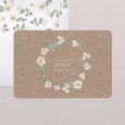Eenvoud straalt met deze witte bloemenkrans op kraft achtergrond. De geboortekaart Rosa blanca kondigt met een zacht briesje de komst van je dochter aan waarvan de geboorte in de lente of zomer verwacht wordt. Welkom meisje!