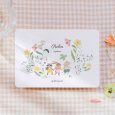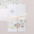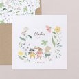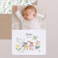 Op het geboortekaartje Lucky day dartelen een muis, een konijn en een wasbeer door een veld vol kleurrijke bloemen. Een vrolijk lentetafereel vol zachtheid, perfect om de komst van jullie kleine wonder aan te kondigen.