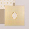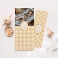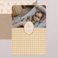 Geïnspireerd door de tijdloze Vichy-stof kondigt het geboortekaartje Vichy – mosterdgeel de geboorte van je kindje aan in warme mosterdtinten. – Kleur: geel, mosterd, beige – Thema: origineel, kleurrijk – Illustraties: Vichy-patroon