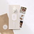 Dit geboortekaartje, gemaakt van hoog kwalitatief papier, heeft twee perforaties waar de bloemetjes doorheen kunnen. Bij dit model hebben we een elegante kraftenvelop uitgekozen die er ook gratis bij geleverd wordt.