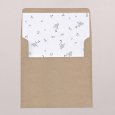 Dit geboortekaartje, gemaakt van hoog kwalitatief papier, heeft twee perforaties waar de bloemetjes doorheen kunnen. Bij dit model hebben we een elegante kraftenvelop uitgekozen die er ook gratis bij geleverd wordt.