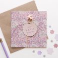 Dit geboortekaartje is een vouwkaart met een apart geperforeerd labetje.Aan de voorzijde van de kaart zijn er twee perforaties voorzien waar het lintje doorheen kan, om zo het labeltje aan de kaart te bevestigen (lintjes apart te bestellen).