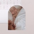 Dit geboortekaartje wordt gekenmerkt door zijn afgeronde bovenranden in de vorm van een boog en kan aan de voor- en achterkant worden gepersonaliseerd met de details van de geboorte van jullie baby.