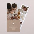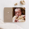 Dit geboortekaartje wordt gekenmerkt door zijn afgeronde bovenranden in de vorm van een boog en kan aan de voor- en achterkant worden gepersonaliseerd met de details van de geboorte van jullie baby.