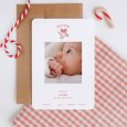 Deel je geluk met zachtheid met het geboortekaartje "Sweety Candy". Kerstsnoepjes, hulst, schattig geïllustreerd lint en roze tinten in het lettertype verfraaien dit model, perfect om de geboorte tijdens de feestdagen aan te kondigen.