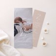 Dit geboortekaartje wordt gekenmerkt door zijn afgeronde bovenranden in de vorm van een boog en kan aan de voor- en achterkant worden gepersonaliseerd met de details van de geboorte van jullie baby.
