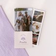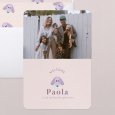 Dit geboortekaartje met de naam Pizy wordt gekenmerkt door zijn elegante eenvoud. De babyfoto en de belangrijkste details van de geboorte worden benadrukt, terwijl de voornaam wordt onthuld in mooie mauve letters. Het iconische motief van Gamin Gamine, een kleine puppy, komt terug op dit ontwerp en brengt het geboortekaartje op een liefdevolle manier.