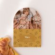 Dit geboortekaartje wordt gekenmerkt door zijn afgeronde bovenranden in de vorm van een boog en kan aan de voor- en achterkant worden gepersonaliseerd met de details van de geboorte van jullie baby.