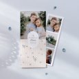 Fijne blauwe vergeet-mij-nietjes sieren de communiekaart Myosotis. Poëtisch en zacht met subtiele strepen, verspreidt dit liefdevolle ontwerp een delicate sfeer en is ideaal om de communie van uw kind in de lente of zomer aan te kondigen.