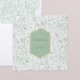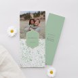De communiekaart Amanda toont een lenteboeket in zachte groentinten, verrijkt met gouden accenten. Dit poëtische en unieke ontwerp is perfect om de communie van uw kind in de lente of zomer stijlvol aan te kondigen.