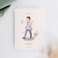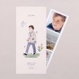 Deze communiekaart Kleine pelgrim toont een jongen met een zelfverzekerde stap en blik in zijn ogen en is overtuigend klaar voor zijn heilige communie of vormsel. De symbolische tortelduif begeleid hem tijdens deze Christelijke weg. De fleurige paasbloemen en het geheel in pastelkleuren, maakt deze uitnodiging ook ideaal voor een lentefeest.
