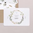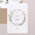 Een symbolische botanische krans van druivenblad, olijf en granen kondigen het vormsel van je kind aan. Deze communiekaart Oogst nodigen familie en vrienden uit voor het plechtige samenkomen rond de communie of lentefeest van je dochter of zoon.