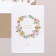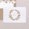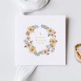Een prachtige tekening van een bloemenkrans in zachte kleuren omringd de naam van je dochter in goudfolie. Ideaal als uitnodiging voor de heilige communie of lentefeest van jullie meisje. Er is ook plaats voorzien voor je favoriete foto en persoonlijke tekst.