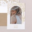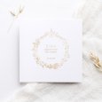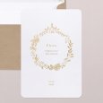 De communiekaart Santa Flora straalt de enthousiasme van de gemeenschap uit voor het inwijden van de Heilige communie van je kind. Een gulle bloemenkrans en kerkje in goudfolie omringen de naam van je dochter of zoon en nodigen met pracht alle familie en vrienden uit voor het samenkomen rond dit plechtig moment.