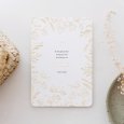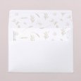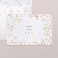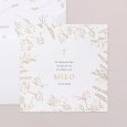 Tarwe; wijn en olijftakken, symbool van overvloed, omringen de naam van je kind in prachtige goudfolie op een zuivere witte achtergrond. Deze communiekaart Eucharistie straalt vertrouwen in het leven en in zijn gemeenschap uit. Nodig familie en vrienden uit voor het plechtige samenkomen rond de Heilige communie of een heugelijk lentefeest voor je dochter of zoon.