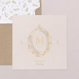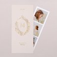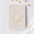Sierlijke ornamenten in goudfolie omringen de eerste letter van de naam. Een feestelijke chique uitnodiging kondigt het bijzondere gebeuren van de heilige communie of vormsel aan bij familie en vrienden.