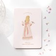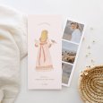 Tederheid overwelmt deze communiekaart: zachte pasteltinten omringen het meisje, verdiept in de lieve uitwisseling met een vogeltje. Deze po?tische illustratie met goudfolie zal familie en vrienden ontroeren voor de communie uitnodiging van je dochter.