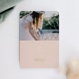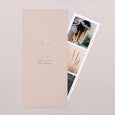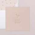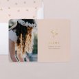 Eenvoud straalt met deze minimalistische opzet van de communiekaart Rapha?lla. Je favoriete communiefoto wordt geaccentueerd dankzij de prachtige zacht roze achtergrond. Een klein duifje in goudfolie kondigt de Heilige communie of heugelijk lentefeest van je dochter aan.