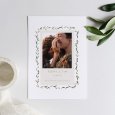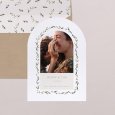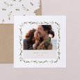 Pastel en een takjeskrans omhullen een sprekende foto van het aanstaande bruidspaar. Deze trouwkaart geeft een botanische moderne uitstraling aan de aankondiging van een elegante bruiloft buiten in de tuin.