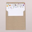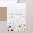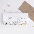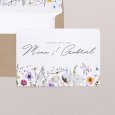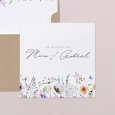 Mooie wilde bloemen schetsen zich af op de trouwkaart Wildery. Deze poëtische samenstelling, verfraaid met elegante typografie, is perfect voor het vieren van een bohemien-themabruiloft.
