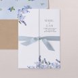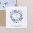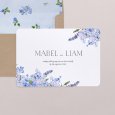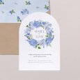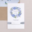 Het klassieke bloementhema krijgt een moderne twist op de trouwkaart Hortense. Een prachtige krans van blauwe bloemen siert dit ontwerp, dat perfect is om de toon te zetten voor een stijlvolle en kleurrijke landelijke bruiloft.