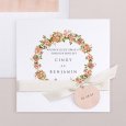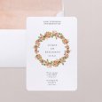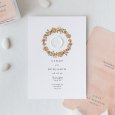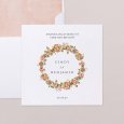 Een symbolische krans van roze bloemen siert de trouwkaart Cottage. Dit verfijnde, kleurrijke en frisse ontwerp is ideaal om een speciale dag met een landelijk, bohemien of romantisch thema aan te kondigen.