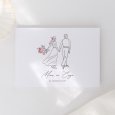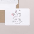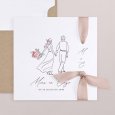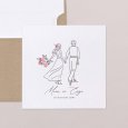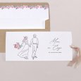 Hand in hand en met liefdevolle details getekend, toont de trouwuitnodiging Ritournelle het bruidspaar in een verfijnde, poëtische illustratie. Accenten met bloemen en een natuurlijke stijl maken deze kaart perfect voor een ontspannen, elegante boho-bruiloft.