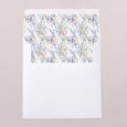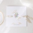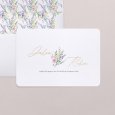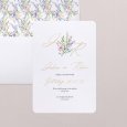 Een delicaat boeket, geschilderd met aquarelverf, siert de trouwkaart My sweet bouquet. De initialen en voornamen van het bruidspaar worden in gouden letters weergegeven op dit poëtische ontwerp: perfect om een chique en landelijke bruiloft aan te kondigen.
