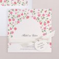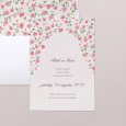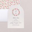 De trouwkaart Sweet roses toont een rozenkrans die de voornamen van het toekomstige bruidspaar, die elegant gekalligrafeerd zijn, omringt. De zachte rozetinten van de aquarelschildering zijn ideaal voor een romantisch of landelijk bruiloftsthema.
