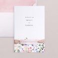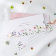 Delicate, kleurrijke wilde bloemen zijn geschetst in waterverf op de Into the bloom huwelijksuitnodiging. Een poëtische creatie met een zachte charme van de lente, perfect om je bruiloft in deze tijd van het jaar of in de zomer aan te kondigen.