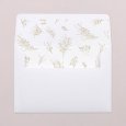 Op de trouwkaart Mozart omringt een tijdloze plantaardige fijne krans jullie namen. Verfijnd met gouden afwerkingen en versierd met kraftpapier, is dit model perfect voor een landelijk trouwthema.