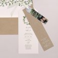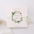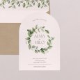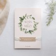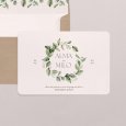 De natuur ontmoet elegantie op de trouwkaart Amedeo. Een prachtige vegetatieve krans omlijst jullie namen op dit tijdloze ontwerp, ideaal voor een viering in op het Franse platteland.