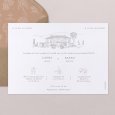 Een prachtig landgoed wordt geschetst op de trouwkaart French Riviera. Weelderige vegetatie en bescheiden bergen verfraaien dit model: perfect om met elegantie jullie bruiloft in Zuid-Frankrijk aan te kondigen.