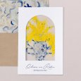 Prachtige mimosa's in zonnige tinten worden uitgenodigd op de trouwkaart Mimosa's. Een schilderij met fijngevoeligheid, dat de charme oproept van een zachte Griekse ontsnapping midden in de zomer.