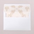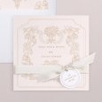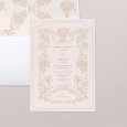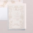Deze uitnodiging bestaat uit een eenvoudige kaart, met een extra drieluik van kalkpapier die je rond de kaart vouwt. Staand formaat.